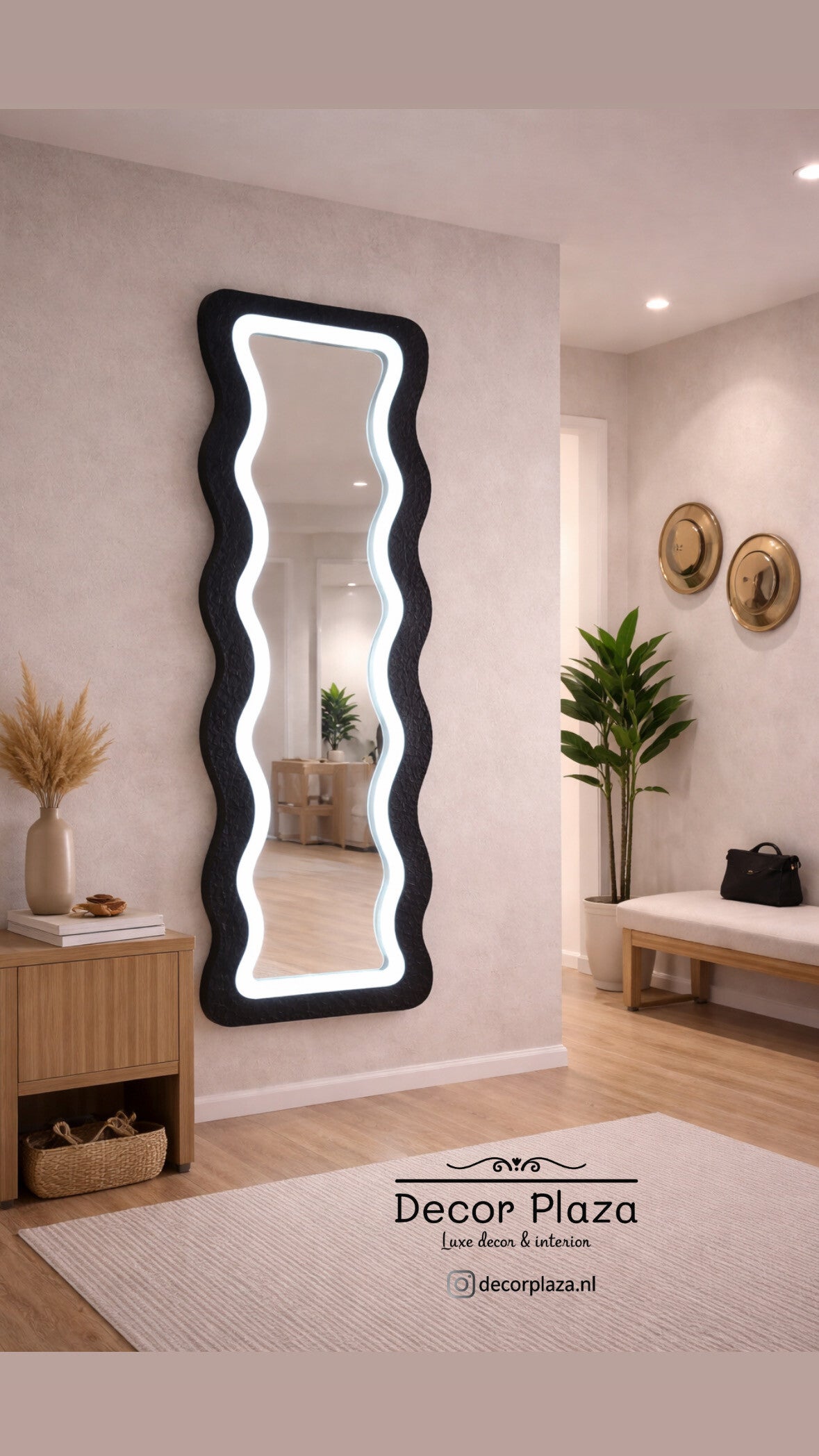 De grote staande spiegel heeft een unieke organische, golvende vorm en is afgewerkt met hoogwaardige teddy stof voor een warme, luxe uitstraling. Overdag is het een stijlvolle design spiegel, ’s avonds creëer je met de geïntegreerde LED verlichting (3 lichtstanden: warm, neutaal en wit licht) een sfeervolle ambiance.